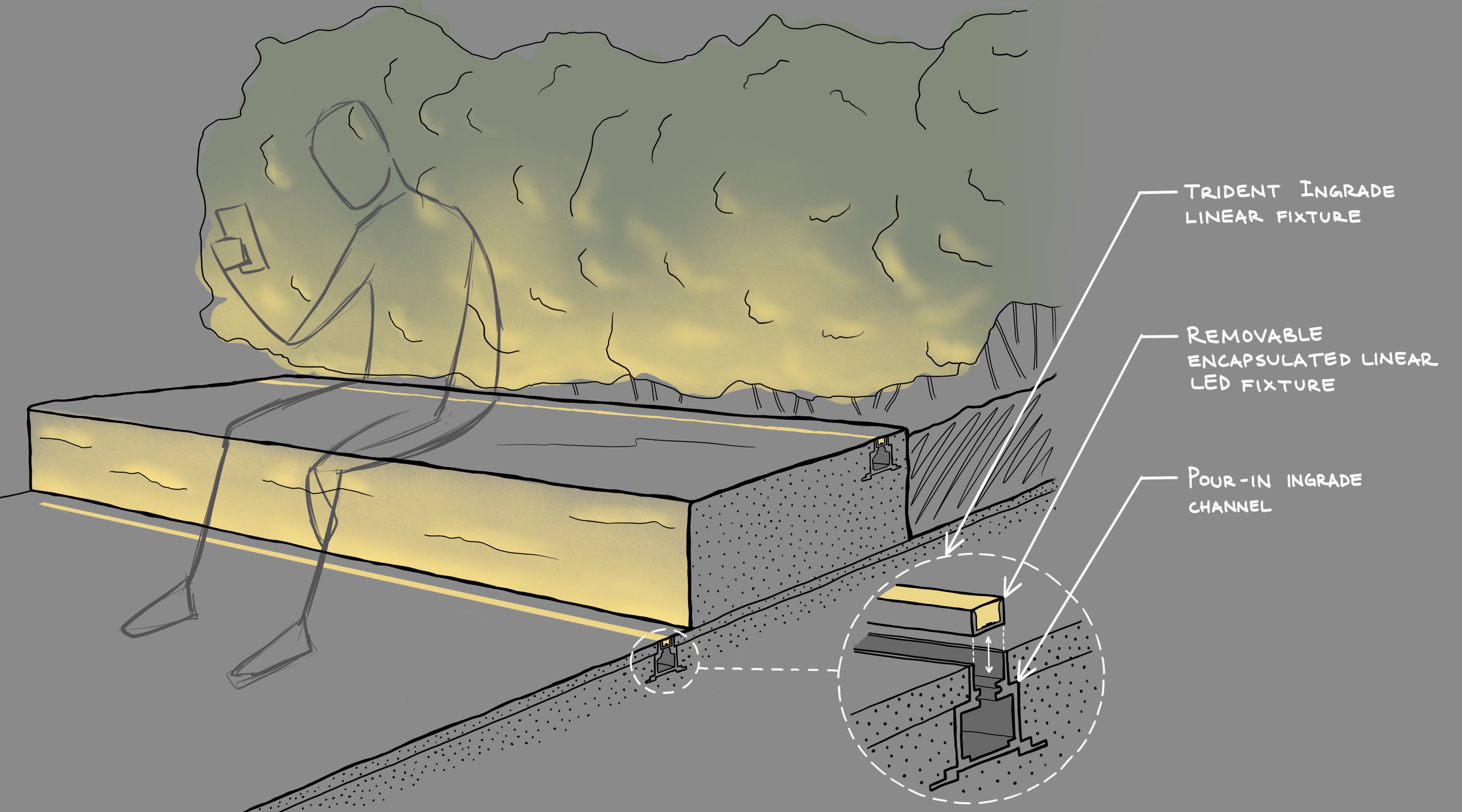 Cut through the darkness with Trident In-grade Linear Lighting from Senso by Luminii. Ideal for in-ground landscape lighting applications, Trident was designed for high traffic areas creating seamless and architecturally beautiful walkways.